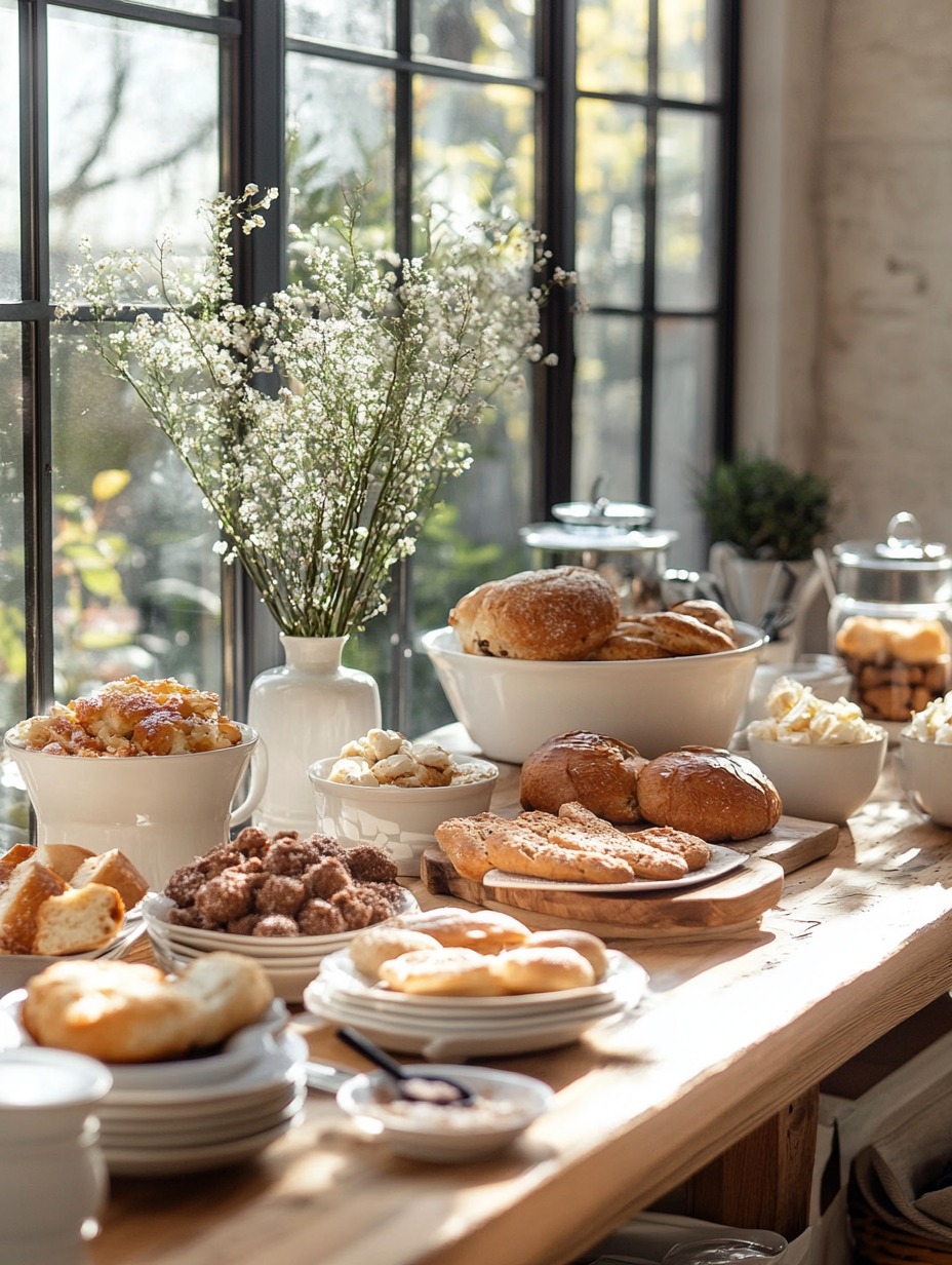 Geburtstagsfrühstück | Croissants, Bagels mit süßen und herzhaften Belägen, Muffins und Torte | Optisch ansprechend und ideal, um den Tag mit Genuss zu starten. Natürlich gekrönt von einer Geburtstagstorte. |